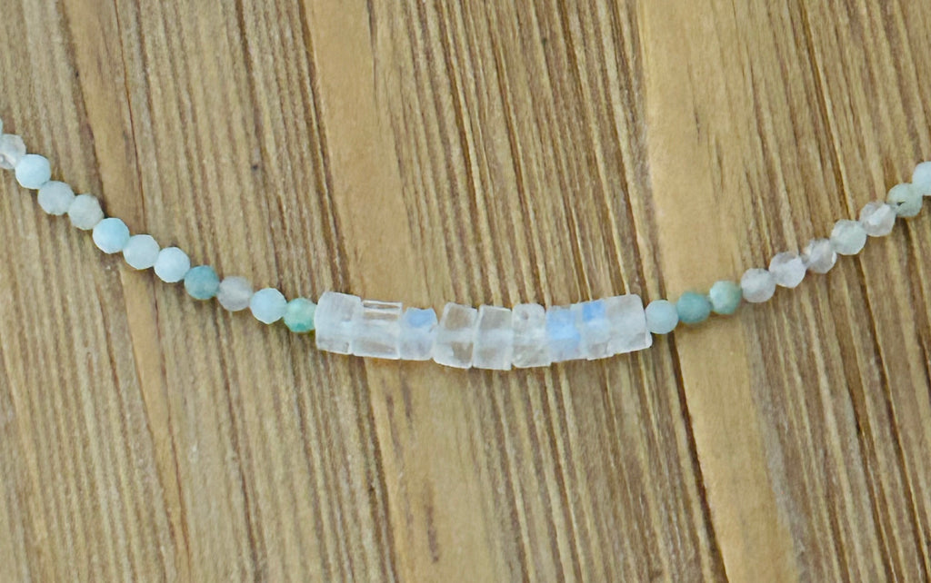 Genuine Amazonite & Moonstone necklace with .925 sterling silver accents & clasp. Created using delicate faceted 2mm Amazonite gemstones and 3mm Heishi style Moonstone.