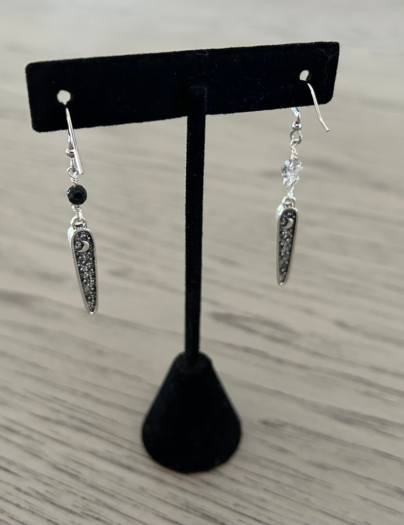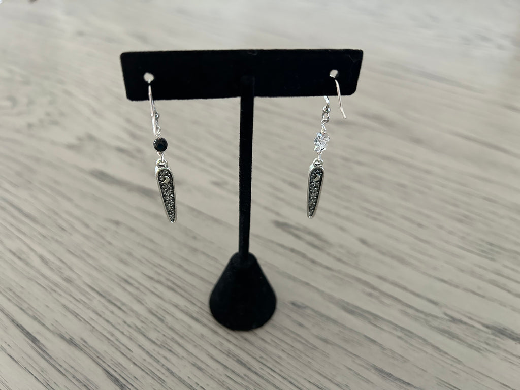 These distinctive asymmetrical earrings pair a 4mm faceted Black Onyx bead with 2-5mm vertically stacked Herkimer Diamond Points for a sophisticated contrast in mineral composition. The design is anchored by a meticulously crafted double-sided charm displaying an owl motif on the front and celestial moon and stars imagery on the reverse, exemplifying the intersection of lapidary precision and symbolic artistry. Approximately 2.25 inches in length.