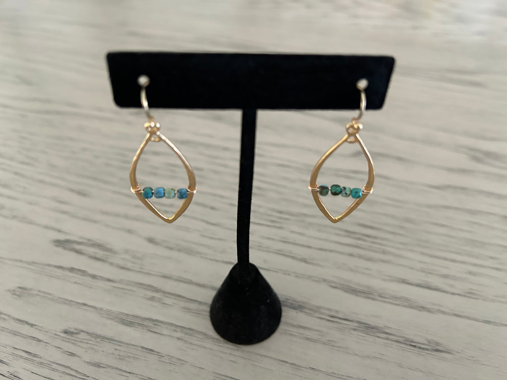 Expertly crafted dangle earrings featuring 2mm faceted Chrysocolla square beads paired with hand-hammered gold-plated elements. The 2-inch length provides elegant movement while the precision faceting enhances the natural blue-green hues of the Chrysocolla. Each earring showcases meticulous metalwork that highlights the stone's natural beauty. Approximately 2 inches in length.
