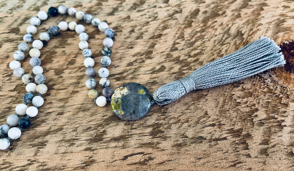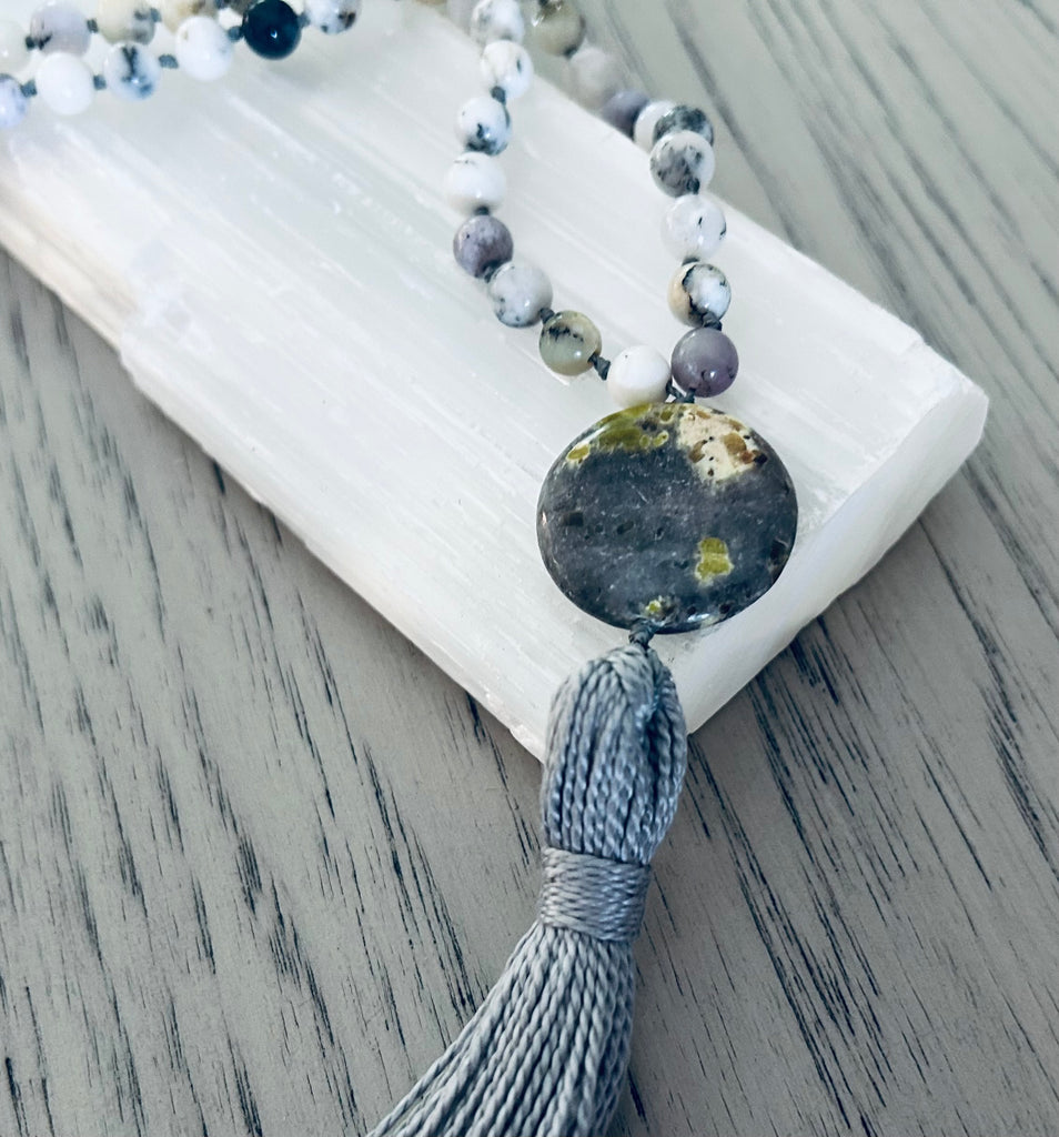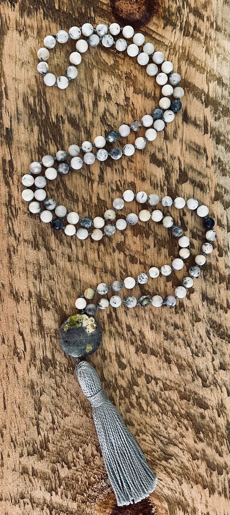 This beautiful mala was created using 6mm Dendric White Opal. The Guru bead is a 25mm coin shaped Ocean Jasper bead. Created using traditional hand knotting with high quality gray nylon cording with a matching gray handmade cotton tassel. This meticulously designed mala enhances meditation and mindfulness practices, offering a meaningful tool for personal transformation.