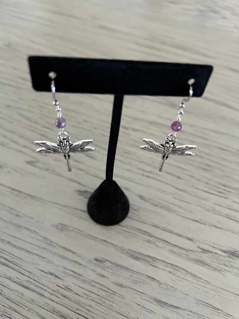 Expertly crafted Fluorite Dragonfly Dangle Earrings featuring luminous 4mm faceted fluorite beads. The intricate dragonfly charms add an elegant touch to these lightweight earrings. Fluorite's natural variations in color create a unique pair that complements both casual and formal attire while symbolizing transformation and adaptability. They are approximately 2.5 inches in length.