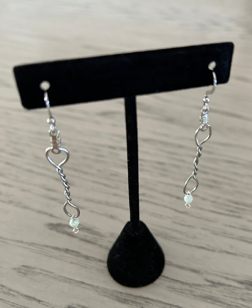 Expertly crafted dangle earrings featuring free-form twisted metal paired with genuine 3mm larimar stones. The unique metal work creates an artistic asymmetry that complements the rare blue larimar—a precious stone found only in the Dominican Republic. Each pair showcases the stone's natural variations, making your earrings truly one-of-a-kind. The earrings are approximately 3 inches in length.