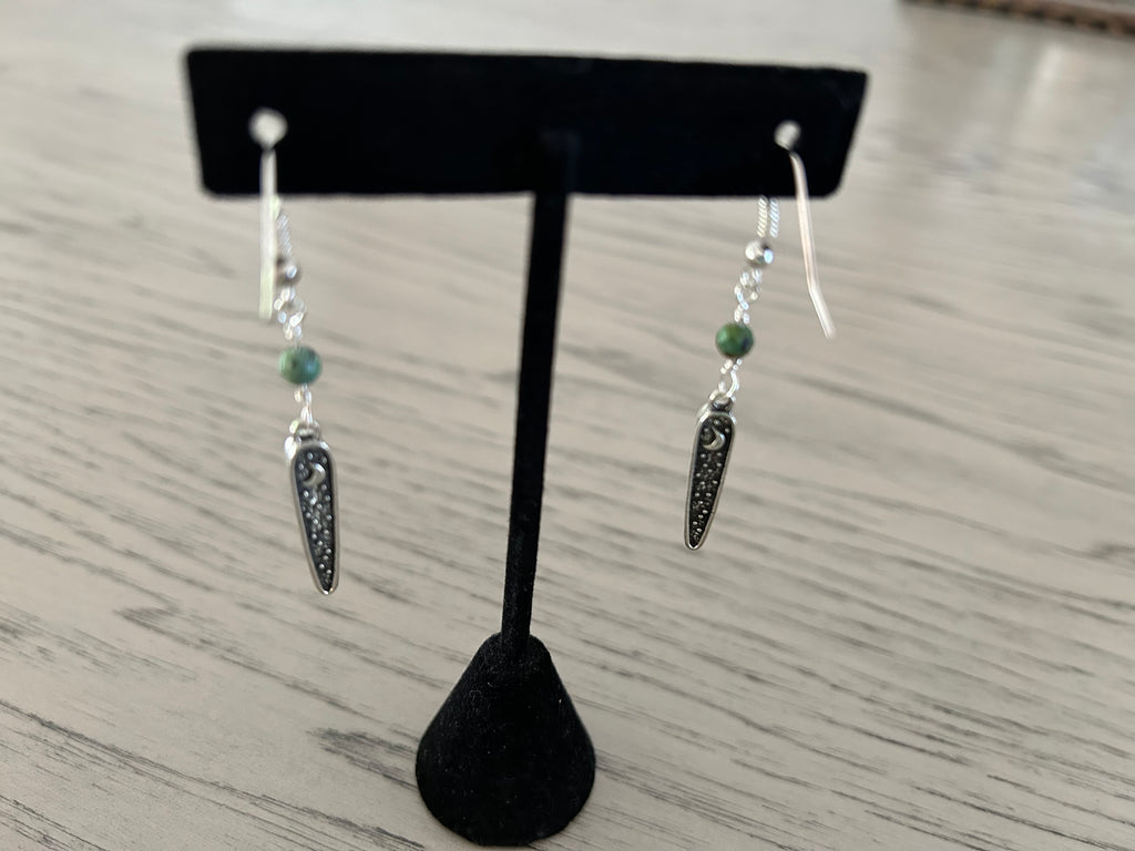 Expertly crafted dangle earrings featuring faceted 4mm genuine Turquoise beads complemented by intricately detailed owl charms. Each charm displays a meticulously designed owl motif on the front with celestial moon and star patterns on the reverse, creating a versatile piece with symbolic significance. The natural variations in Turquoise enhance the earrings' authentic character. Approximately 2.25 inches in length.